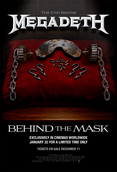 La película "Megadeth: Behind The Mask" está cada vez más cerca. Llegará a la gran pantalla el jueves 22 de enero, tan solo un día antes del lanzamiento del nuevo y último álbum de Dave Mustaine y los suyos. Se proyectará en más de 35 países y en más de 100 cines. Las entradas saldrán a la venta el 11 de enero a las 15:00 horas, y ese mismo día se publicará el tráiler del filme.