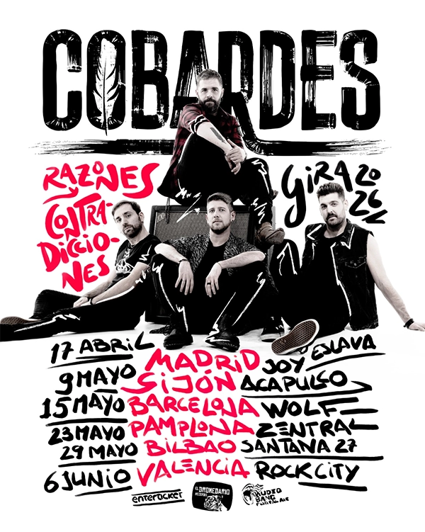 “Razones y contradicciones” es el nombre bajo el que se han presentado las primeras fechas de conciertos que ofrecerá Cobardes este 2026, una gira que tiene marcada su primera parada el próximo 17 de abril en el Teatro Eslava de Madrid y que posteriormente pasará por Gijón, Barcelona, Pamplona, Bilbao y Valencia a falta de conocer más paradas en las que presentar sus nuevas canciones y los clásicos que ya no pueden faltar en el repertorio de Cobardes.