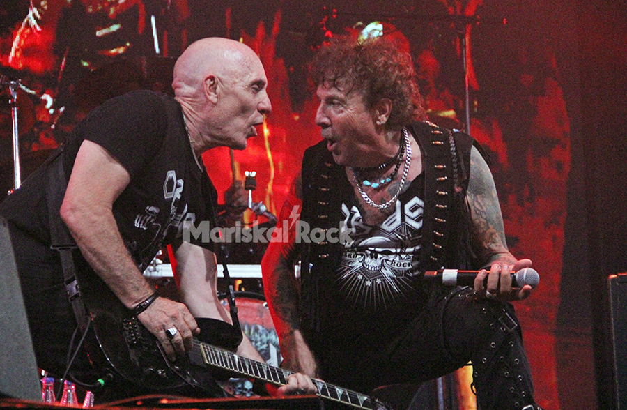 Con la energía a tope y las cuerdas vocales bien engrasadas, Tete gritaba a los “Vientos de guerra”, “Maldito corazón” y nos abría “Las puertas del cielo” al que llegábamos para relajarnos y bajar el ritmo de nuestras pulsaciones, que estaban al borde de la taquicardia, para lo que nos ayudamos de dos “baladones” como “Lejos de ti” y “Si amaneciera”. Esta última es de mis predilectas desde la época de Leo Jiménez en la banda, que será el invitado especial en Las Ventas para interpretar cuatro temas de la formación de la Villa y cantará a dúo con Tete otros cuantos.