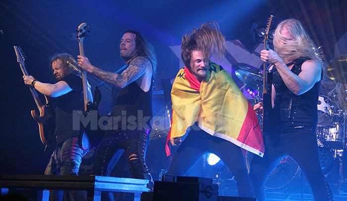 Después de los entrantes, el plato fuerte de la noche irrumpe con fuerza en el escenario de la sala Custom de Sevilla, ciudad en la que actúan por primera vez y a la que esperan volver, según dijo Molin. Desde su primer tema, “In the Arms of a Devil”, arrancaron con una potencia jovial e indescriptible, ante una sala llena de amantes del género dispuestos a presenciar uno de los espectáculos más sólidos y ambiciosos de la trayectoria de la banda.