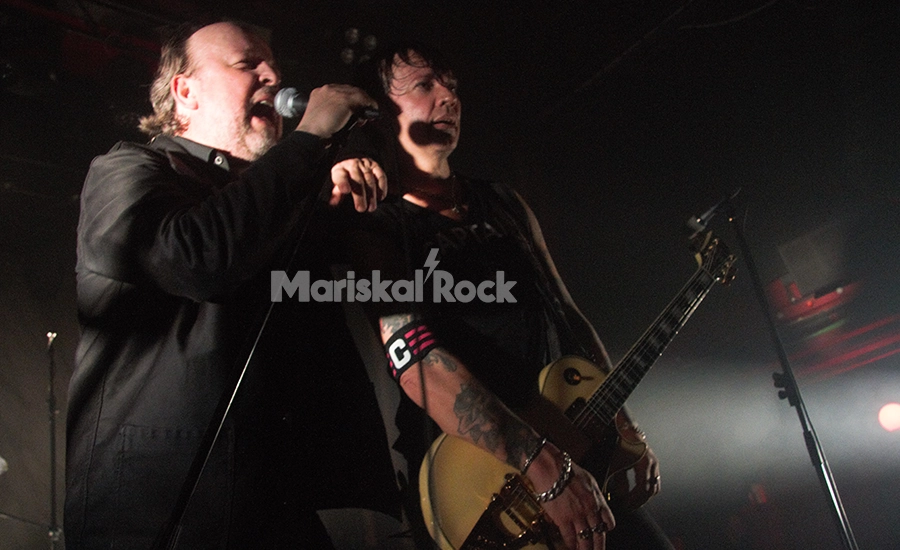 Sin darnos respiro, enlazaron con “Automatic Thrill” y la sala explotó. El salto al speed rock convirtió la pista en un hervidero instantáneo. Biff Malibu apareció como el perfecto maestro de ceremonias: chaqueta negra impecable, gesto entre predicador y tahúr de casino, y esa presencia que no se enseña. Desde el primer minuto bajó a las primeras filas, buscó el contacto, señaló, empujó, agitó… y, como buen animal de escenario, no tardó en jugar también con las cámaras: acercamientos frontales, mirada fija al objetivo, sonrisa torcida y ese rostro curtido ocupando encuadres enteros, carne de instantánea en tamaño carnet, puro rock ’n’ roll sin filtro.