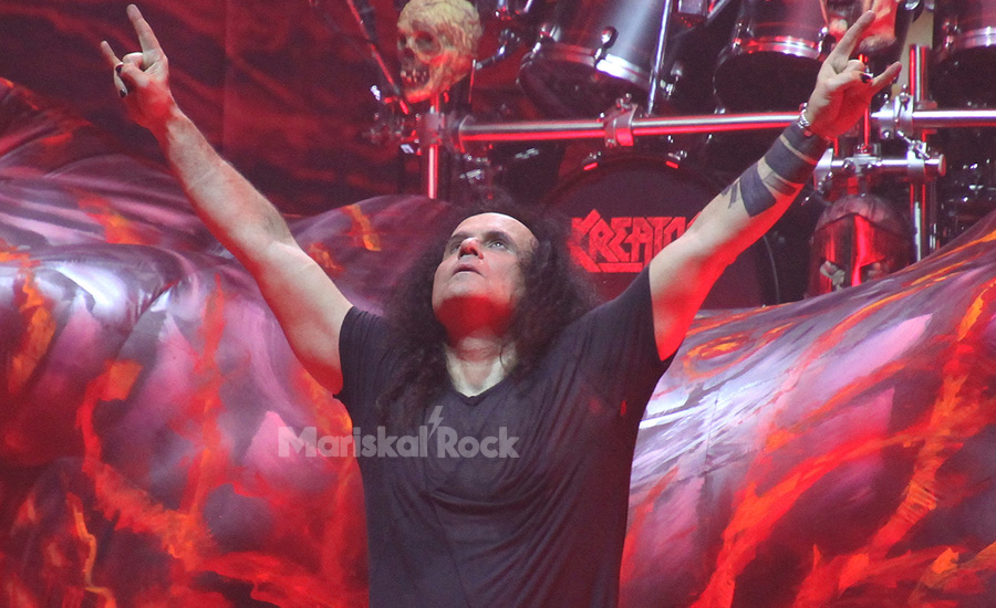 A las nueve y media de la noche, “Run to the Hills” de la Dama de Hierro anunciaba el inicio y, bajo un sonido potente y devastador, comenzaba el espectáculo macabro e infernal en directo de los reyes del thrash metal europeo, en el recinto engalanado de negro y cuero para la ocasión, donde sus hordas más fieles los esperaban ansiosos. Mille Petrozza, armado con su guitarra, al mando de su ejército formado por Jürgen “Ventor” Reil a la batería, Sami Yli-Sirniö a la guitarra y Frédéric Leclercq al bajo, comenzaba sin demora la descarga de todo su arsenal de guerra.