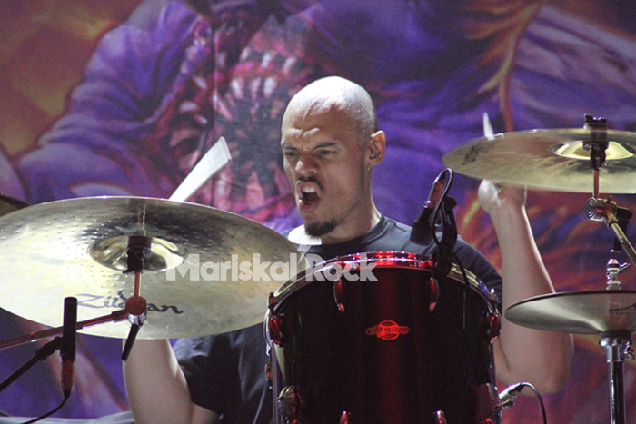 Como telón de fondo, la portada de su último trabajo, que nació el 20 de este mismo mes y del que aún cuelga el cordón umbilical que, con más de treinta y cinco años de existencia, todavía tiene mucho que contar. Entraron arrasando, calentando poco a poco el ambiente de la sala que ya había sido precalentado, con una ejecución instrumental y vocal cargada de velocidad, aunque se echa de menos a “Zetro” Souza, quien dejaba la banda el año pasado.