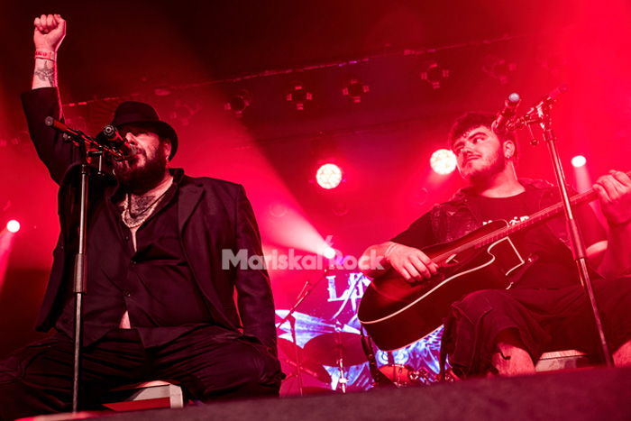 En primer lugar fue interpretada “Aun me duele”, en formato acústico, como en el disco, con Pete, guitarrista de Cuatro Madres y de Kutxi Romero en solitario, a la guitarra. Fue un momento muy bonito, que sería el comienzo de algo mayor, y es que, seguidamente, y “ahora sí”, como dijo Aarón, “llegó el patriarca, un fuerte aplauso para el cantante de los Marea, Kutxi Romero”. La apoteosis de este paréntesis acústico vino con la versión de “Golfa”, de Extremoduro, en la que colaboró Alén Ayerdi al cajón, y donde se sentía la emoción en el aire al recordar a Roberto Iniesta, presente en la camiseta de Alén, y en los corazones de gran parte del público, entre los que se podía ver alguna lagrima de emoción sincera.