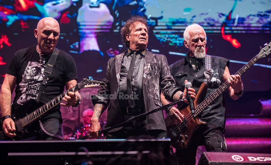 El doble bombo de Fernando Sánchez en “Pesadilla nuclear” nos puso tan incandescentes como las chispas del escenario. Fortu nos dejó flipados con sus agudos casi 45 años después, tras el solo de Paco Laguna, y el tema fue coronado por un sonoro “No a la guerra” del cantante.