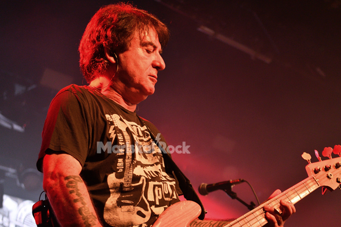 A las 21:00h se apagan las luces, y acompañando al “Always look on the bright side of light” se arman dos mini telones a juego con el rojizo fondo con logo en blanco que lucía en la pantalla trasera. “35 takos” enciende la velada tras el “A las buenas noches, Madrid” del Bode; me parece un tema más que interesante, pero reprimió el empuje de los de abajo. La mayoría de los allí congregados era pura vieja escuela, de los tiempos que transcurrieron entre ‘Que se vayan hacer puñetas’ y ‘Baladas pa un sordo’. O más o menos. Total, que mi sensación es que la furia de la masa no arrancó ahí, pero sí lo hizo con “Joder que cruz”, “Si lo sé me meo”, “Si nos dejáis” y “Hortaleza”.