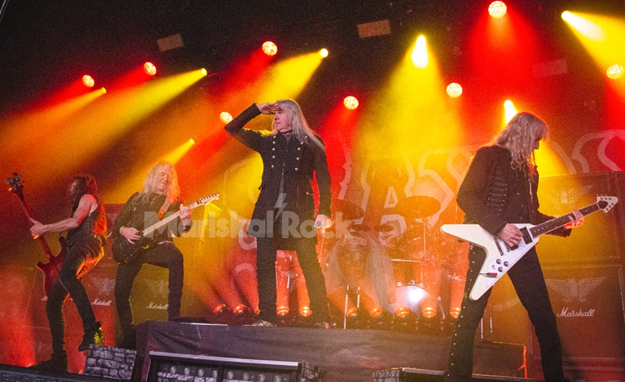 Empezamos a eso de las 21:00, ya con la sala a reventar, como en las mejores noches, y un escenario bastante sobrio, eso sí, con las paredes de amplis con el águila de Saxon, y el logo clásico en el gran telón tras la enorme batería de Nigel Glocker. “Hell, Fire and Damnation”, tema título del último disco, y en cuanto se terminó de ecualizar el sonido y de sonar perfectas las guitarras, a disfrutar de los dos primeros superclásicos de la noche, tanto “Power and the Glory” y “Solid Ball of Rock”, ¡casi nada! Cierto que “Solid” fue la única concesión a esa fantástica segunda etapa de la banda, y nos supo a gloria.