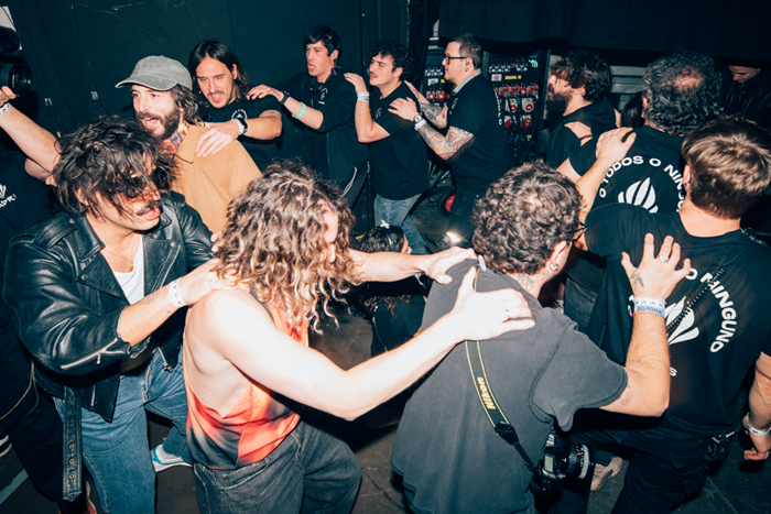 El propio frontman, ya con el bajo colgado, anunció que habían reservado otro Movistar Arena para el año que viene para que cupiésemos todos, abriendo la puerta al que posiblemente sea su primer Palacio de los Deportes abierto y lleno al completo. Era momento de echar el resto, y lo hicieron con “Quiero follar contigo” y “Pogo”, en la que tocó el bajo su productor, Raúl Pérez, porque Gabriel se bajó a cantar entre el público y acabó llevado en volandas, en una simbiosis absoluta entre banda y asistentes. El derroche de energía era total, y a lo largo del coso había pogos de diversa índole: circle pits, walls of death, mosh común… Como si se tratase de un museo del particular y enérgico baile.