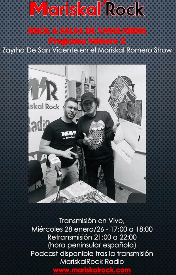 En el programa de hoy, Mariskal volverá a estar acompañado por Zayrho De San Vicente, médico, escritor, percusionista amateur e investigador sobre ritmos afro-cubanos y antillanos (salsa, son cubano, jazz latino), con el que el rock abre sus puertas a la salsa de vanguardia en esta segunda entrega.