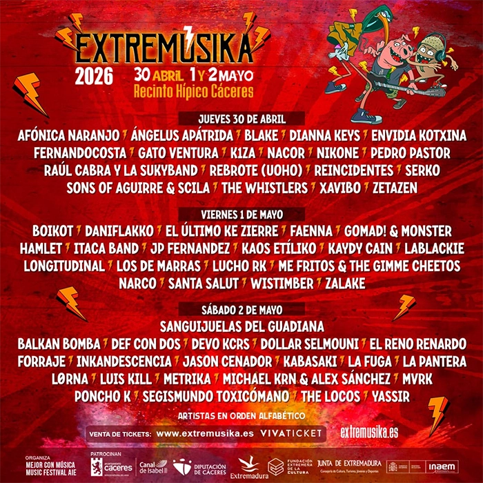 Jason recibirá hoy en el programa a Fátima Rodríguez, directora de Extremúsika, el gran festival extremeño que este año aparece como una de las más potentes y madrugadoras propuestas que nos esperan. Angelus Apatrida, Rebrote, Reincidentes, La Fuga, Boikot o Def Con Dos son solo algunos ejemplos del espectacular cartel (ya repartido entre sus tres jornadas) que se desarrollará los días 30 de abril, 1 y 2 de mayo en el Recinto Hípico de Cáceres.
