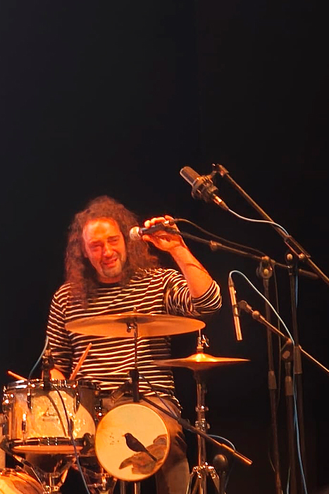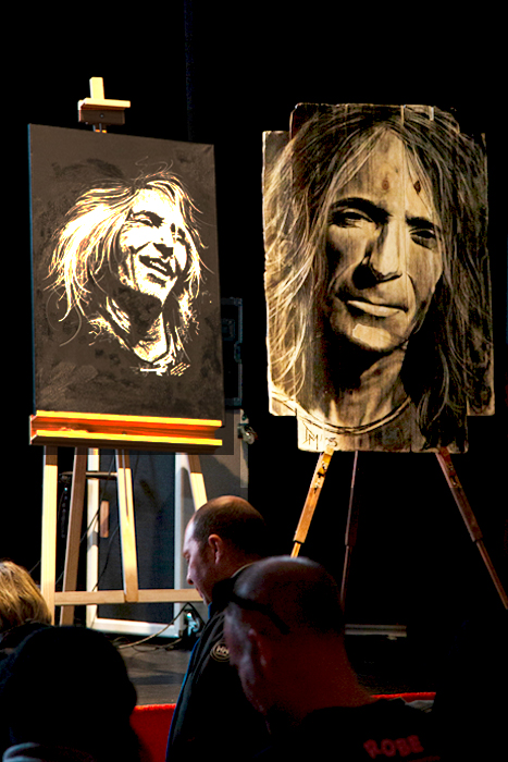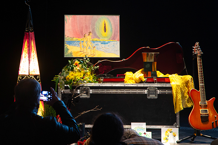 Sobre el escenario, lo primero que descubres es una guitarra sobre su baúl de viaje, el último viaje. También sobre el baúl hay un recipiente en el que intuyes que descansan sus cenizas. Están rodeadas por su fular amarillo y custodiadas por un lienzo que entremezcla las portadas de ‘Deltoya’ y ‘Mayéutica’. Una joven artista pinta en directo un retrato de Robe; cuesta mirarle a los ojos.