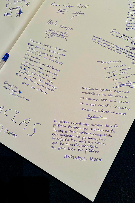Sobre varias mesas se han dispuesto los libros de condolencias y la gente se vacía: “Gracias por haber sido el pegamento emocional de mi familia más cercana y de esa otra que hemos construido alrededor de ti”, “contigo aprendí el poder del arte”, “gracias por haber hecho cada segundo mi mundo mejor”, “te llevo tatuado en el alma y en la piel”. Personas de todas las edades muestran respeto, admiración y amor a Robe, pero, sobre todo, muestran un profundo agradecimiento.