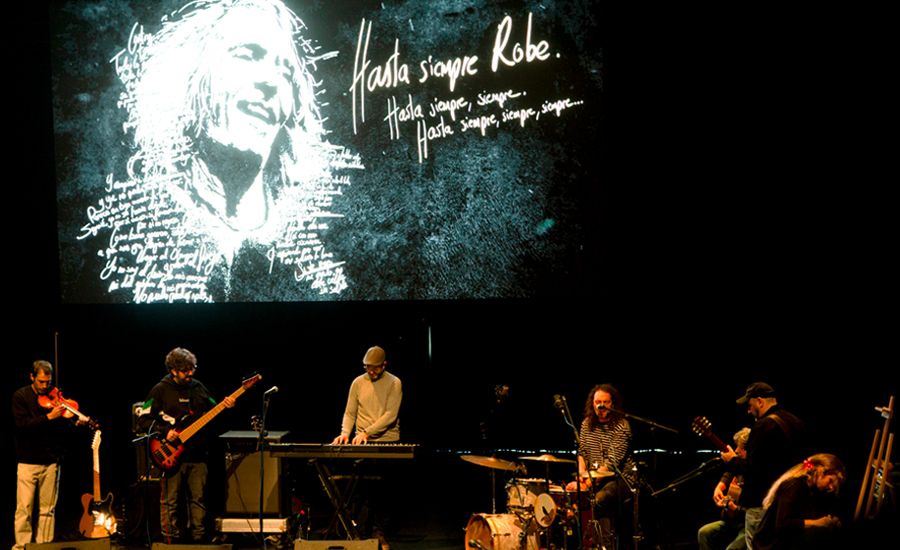 Sobre el escenario, lo primero que descubres es una guitarra sobre su baúl de viaje, el último viaje. También sobre el baúl hay un recipiente en el que intuyes que descansan sus cenizas. Están rodeadas por su fular amarillo y custodiadas por un lienzo que entremezcla las portadas de ‘Deltoya’ y ‘Mayéutica’. Una joven artista pinta en directo un retrato de Robe; cuesta mirarle a los ojos.