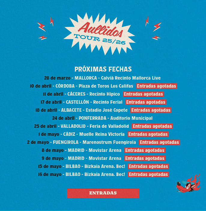 El pasado fin de semana, Fito & Fitipaldis ofrecieron dos actuaciones consecutivas en el Live Sur Stadium de Sevilla, con todas las entradas agotadas. La gira "Aullidos Tour" continúa por distintas ciudades y afronta su última parte antes de su cierre el 16 de mayo en Bilbao. A continuación, encontrarás los conciertos restantes; muchos de ellos ya han colgado el cartel de sold out, pero aún puedes conseguir entradas para algunos a través de este enlace.