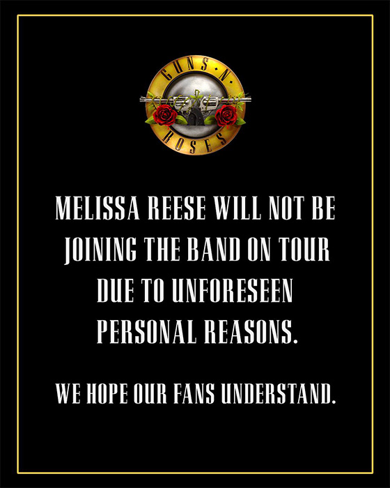 Guns N’ Roses lo tiene todo preparado para lanzarse a la carretera. Mañana, 28 de marzo, su gira dará el pistoletazo de salida, comenzando con un concierto en Monterrey (México). Sin embargo, de manera imprevista, han anunciado que uno de sus miembros se baja del carro y no participará en sus próximos conciertos. Se trata de la teclista estadounidense Melissa Reese, quien “no se unirá a la banda en la gira debido a motivos personales imprevistos”. Así lo ha explicado la propia banda a través de un comunicado en sus redes sociales, en el que también escriben: “Esperamos que nuestros fans entiendan”.