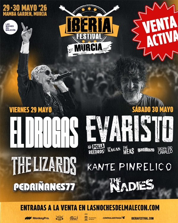 La propuesta de Iberia Festival también nos ofrecerá dos fechas en Murcia en el mes de mayo, con El Drogas, The Lizards y Pedriñanes 77 el 29 de mayo, y Evaristo, Kante Pinrelico y The Naides el 30 de mayo en el Mamba Garden de Murcia completando estas noches rockeras. Las entradas para los conciertos en Murcia están a la venta en este enlace.
