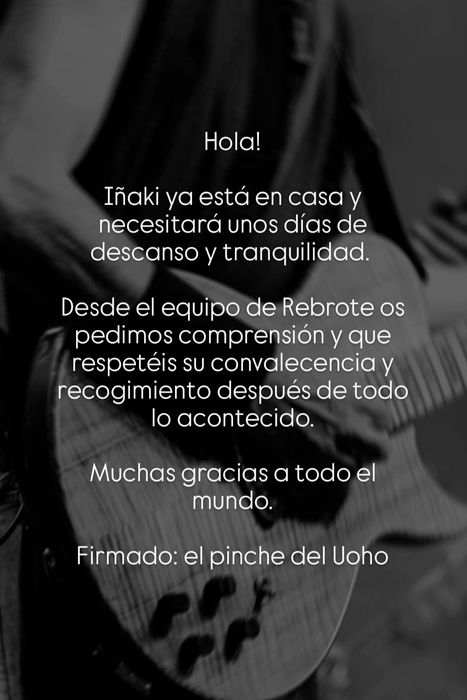 El mítico guitarrista, conocido también por su paso por Platero y Tú, ya ha salido del hospital y se encuentra descansando en su casa. La noticia se ha comunicado a través de sus redes sociales: “Iñaki ya está en casa y necesitará unos días de descanso y tranquilidad. Desde el equipo de Rebrote os pedimos comprensión y que respetéis su convalecencia y recogimiento después de todo lo acontecido. Muchas gracias a todo el mundo. Firmado: el pinche del Uoho”.