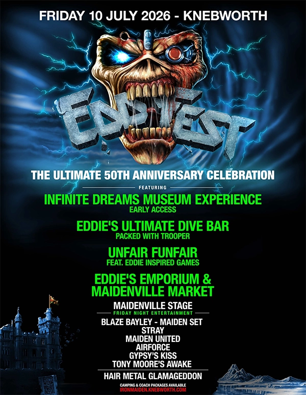 Nos ofrece más detalles: “En las últimas giras, hemos organizado los bares Eddie Dive para nuestros fans, tanto antes como después de los conciertos. Algunos de estos eventos se apoderaron de los centros de las ciudades, con miles de fans reunidos disfrutando de la diversión, la música y la compañía mutua. Por eso, Eddfest va a expandir ese concepto de muchas maneras diferentes, para crear un auténtico "mundo de Maiden" imperdible durante todo el fin de semana. Habrá muchísima buena música, buena cerveza (¡por supuesto!), un montón de actividades divertidas y variadas, fantásticos recuerdos y merchandising, oportunidades únicas para hacer fotos y crear recuerdos inolvidables de Maiden, y, por supuesto, la verdadera camaradería que se vive entre los fans de Maiden”.