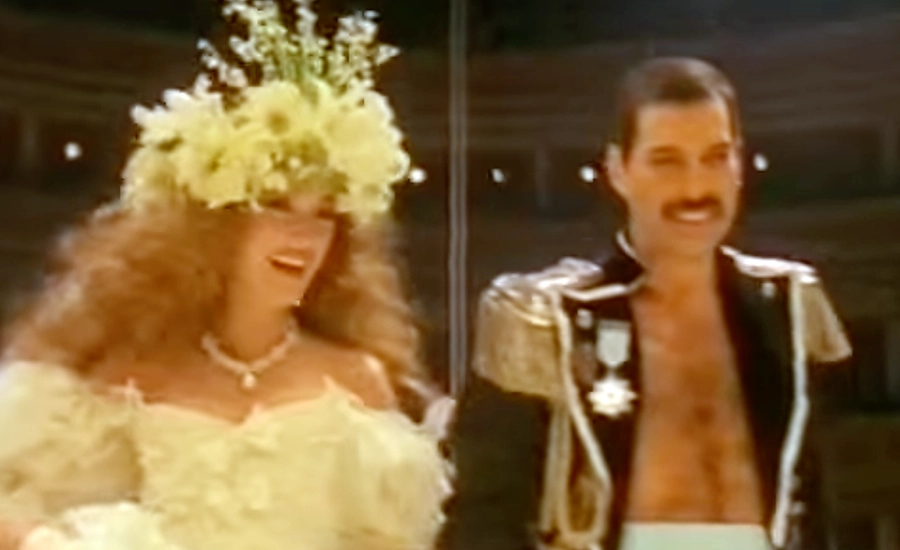 El siempre provocador vocalista de Queen no iba a tardar en llamar la atención: “Freddie se puso a actuar por ahí haciendo de Freddie Mercury y yo se suponía que era su novia, así que yo iba corriendo detrás como una loca y tan rápido como podía, con ese vestido enorme, ese tocado que me estaba matando y las flores que apenas podía llevar, pero con una sonrisa en la cara”.