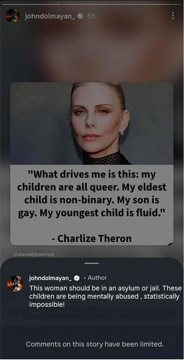El batería ha generado una nueva polémica tras criticar duramente unos comentarios realizados por la actriz sobre la orientación sexual de sus hijos. Todo surgió a raíz de una entrevista en la que Theron declaró: “Lo que me motiva es esto: todos mis hijos son queer. Mi hijo mayor es no binario. Mi hijo es gay. Mi hijo menor es de género fluido”.