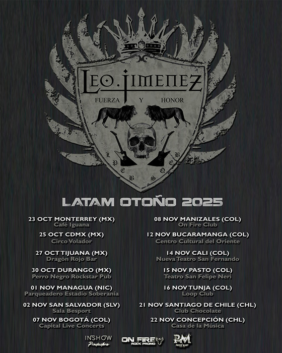 El tour continuará más al sur con dos paradas muy esperadas en Chile, donde Leo Jiménez actuará el 21 de noviembre en Santiago (Club Chocolate) y el 22 de noviembre en Concepción (Casa de la Música), poniendo así el broche final a esta intensa aventura latinoamericana.