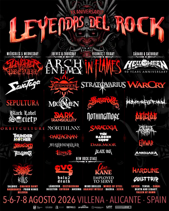 Grandes nombres como Helloween, In Flames, Savatage, Arch Enemy, Slaughter To Prevail, Godsmack, Warcry, Sepultura, Black Label Society, Hardline, Heaven Shall Burn, Dark Tranquillity o Saurom, entre otros, encabezan la atractiva y variada oferta para 2026, ¡casi nada!
