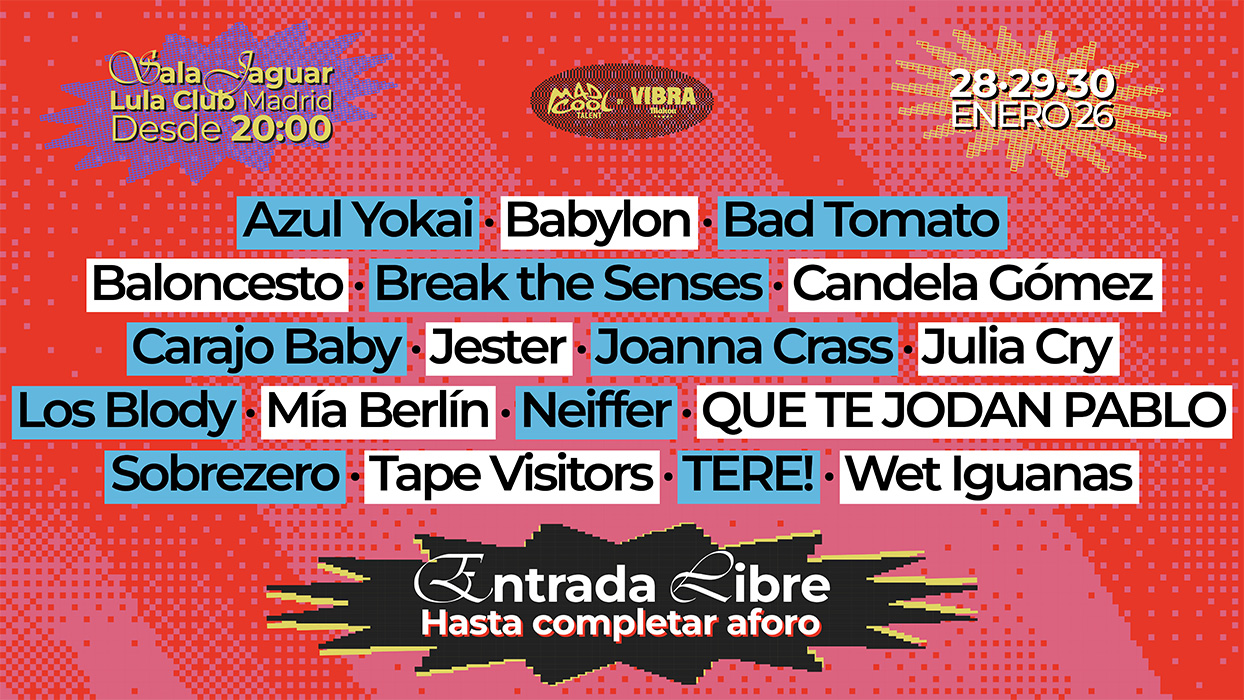 El cartel de las finales de Mad Cool Talent by Vibra Mahou está cerrado; ahora solo queda conocer quién se subirá al escenario de uno de los festivales más importantes y aclamados de nuestro país. Estos son los 18 artistas que participarán en la final: Los Blody, Tape Visitors, Wet Iguanas, Babylon, Bad Tomato, Azul Yokai, Jester, TERE!, Sobrezero, Carajo Baby, Break The Senses, Baloncesto, Julia Cry, Candela Gómez, Neiffer, Mía Berlin, Joanna Crass y QUE TE JODAN PABLO.