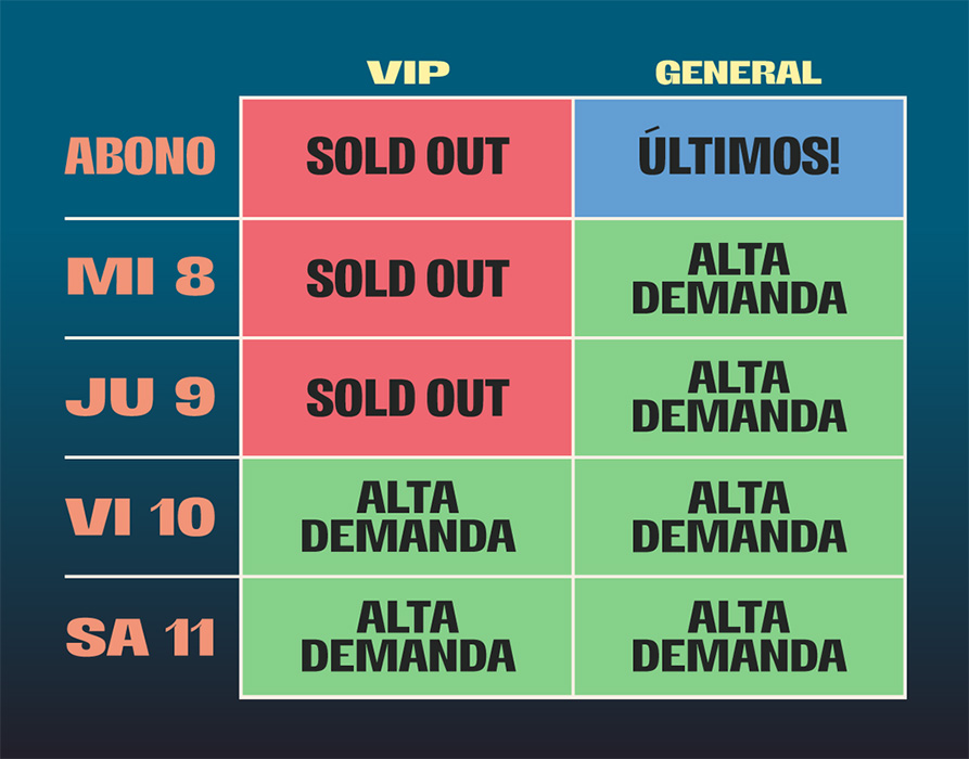 El evento ha vendido todas sus entradas VIP para los cuatro días y las generales están en las últimas. Por otro lado, las entradas diarias del miércoles 8 de julio y del jueves 9 de julio también han agotado sus modalidades VIP. El resto de entradas diarias tienen una alta demanda tanto en esta categoría como en la general. Por lo tanto, próximamente, el Mad Cool podría vender todos sus tickets.