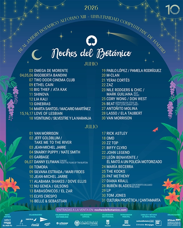 Con más de 65.000 entradas vendidas y nueve conciertos ya agotados desde que se lanzó el primer avance del cartel, llegan los nuevos nombres y fechas que completan la programación de este impresionante décimo aniversario que se desarrollará del 3 de junio al 31 de julio en el privilegiado marco que aporta el Real Jardín Botánico Alfonso XIII de la Universidad Complutense de Madrid.