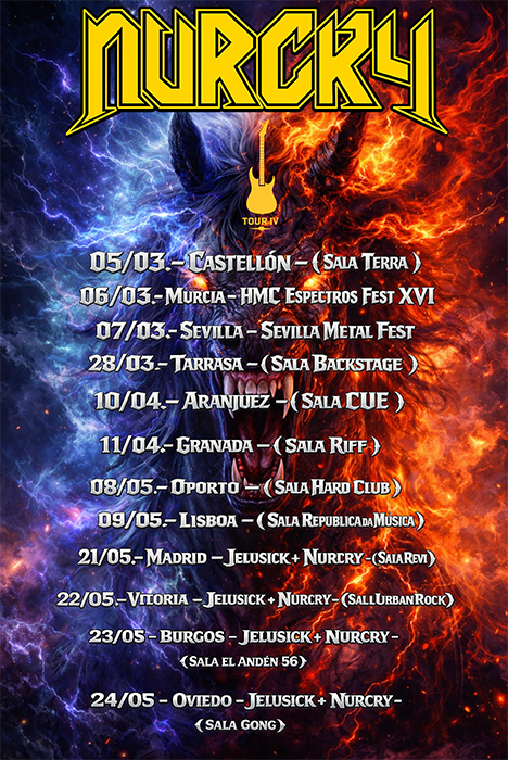 Durante esta gira compartirán escenario con bandas de la talla de Jelusick, la formación del vocalista al que hemos disfrutado con Whitesnake o Trans-Siberian Orchestra. Además, en su itinerario también participarán otros grupos como Iron Savior, Invicti y Nidhögg, con quienes tocarán en el Sevilla Metal Fest, en la Sala Supra de Sevilla el 7 de marzo. Al día siguiente, 28 de marzo, estarán en Terrassa (Barcelona), en la Sala Backstage, acompañados de Krápula y NMT. Y esto no termina aquí: de estas ambiciosas citas, encontrarás muchas más al final de esta noticia. Si no quieres perderte a Nurcry en el punto más alto de su trayectoria, ya puedes adquirir tus entradas en este enlace.