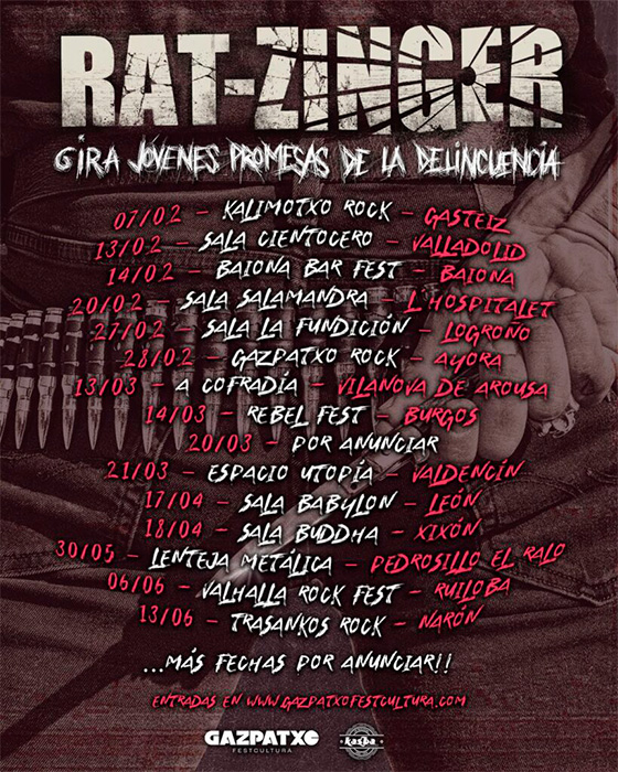 Los bilbaínos Rat-Zinger siguen deleitando con su potente sonido cargado de matices heredados directamente del rock radical vasco de los años 80. El conjunto acaba de lanzar "Jóvenes promesas de la delincuencia", el primer single y videoclip, que da nombre a su nuevo disco. Lo presentarán en directo a través de una serie de conciertos, que encontrarás al final de esta noticia.