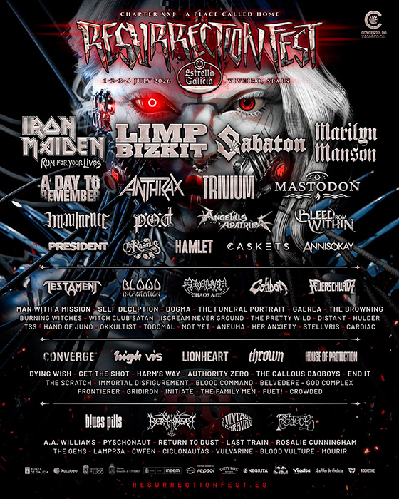 - Resurrection Fest confirma a Sabaton, A Day To Remember, Anthrax y otras 61 bandas para su cartel de 2026 con Iron Maiden o Marilyn Manson al frente - 27 noviembre 2025