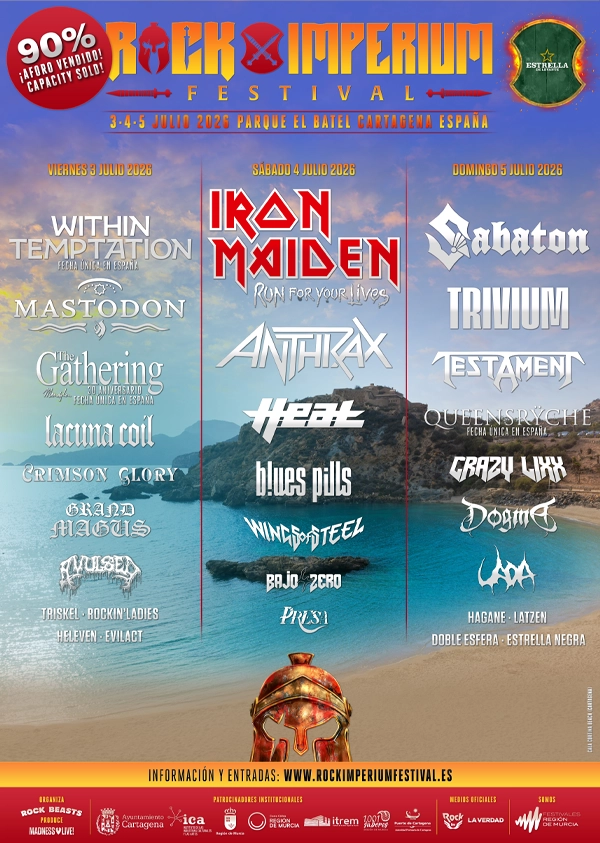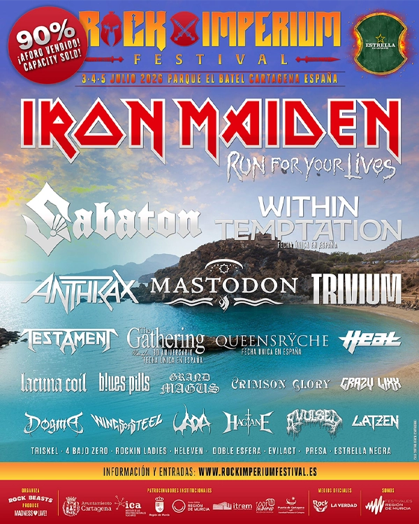 Uno de los festivales más importantes y atractivos de la inminente nueva temporada de grandes eventos de rock y metal en nuestro país, Rock Imperium Festival, nos confirma la venta del 90% del aforo de cara a la edición de 2026, en la que Within Temptation, Iron Maiden y Sabaton lideran, respectivamente, las intensas jornadas del 3, 4 y 5 de julio, que se desarrollarán en el Parque El Batel de Cartagena. Quedan entradas a la venta en este enlace.
