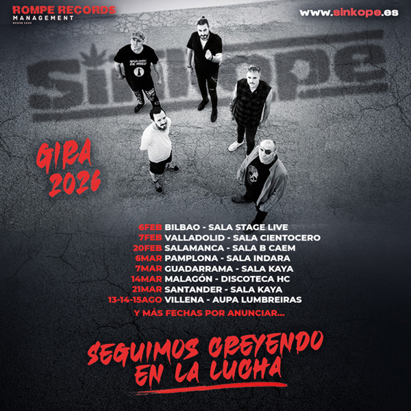 Tras un más que exitoso 2025, colgando el cartel de sold out en la mayoría de sus conciertos y cerrando la gira de presentación de su último disco, 'Crecer y luchar', con un broche de oro en La Sala La Riviera (Madrid), Sínkope vuelve a los escenarios Así lo ha anunciado la banda presentando las primeras fechas y lugares que visitarán durante el próximo año. En el primer trimestre estarán en ciudades como Bilbao, Valladolid, Salamanca, Santander, Pamplona, y salas de localidades más pequeñas como Guadarrama o Malagón. De momento, estas son todas las fechas confirmadas: