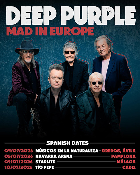 Deep Purple regresará a nuestro país en 2026 dentro de la gira "Mad in Europe Tour". Su recorrido por España comenzará el 4 de julio de 2026 en Gredos, Ávila, encabezando el festival Músicos en la Naturaleza. Las entradas están disponibles en la página oficial del evento. Al día siguiente, llevarán su música al Navarra Arena, en Pamplona (puedes conseguir tickets aquí). El festival Starlite acogerá a Deep Purple el jueves 9 de julio (entradas aquí) y finalmente el 10 de julio cerrarán su periplo por la península en el Tío Pepe Festival, en Jerez de la Frontera, Cádiz. Las entradas ya están disponibles en este enlace.