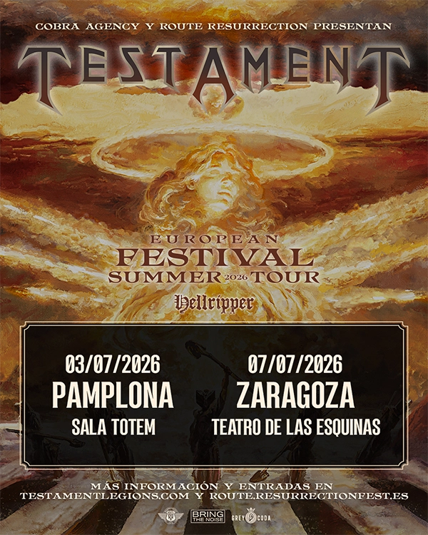 Pamplona y Zaragoza acogerán dos citas muy especiales en las que disfrutar de la descarga de una de las bandas esenciales del género cara a cara, en un formato cercano en salas como la Totem en la capital navarra o el Teatro de las Esquinas en la aragonesa. Estas son las fechas de los nuevos conciertos de Testament en España con la gira Route Resurrection: Thrash Attack!: