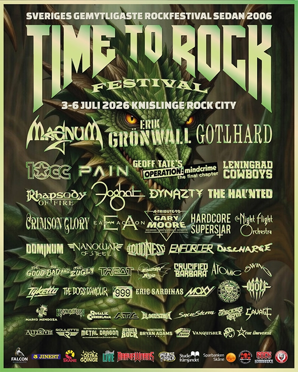 Los primeros días del próximo mes de julio contarán con la celebración de uno de los más interesantes carteles que encontramos en esta nueva temporada de festivales en Europa, el sueco Time to Rock, que los días 3, 4, 5 y 6 tendrán en la Knislinge Rock City de Knislinge (Suecia) actuaciones de Magnum, Erik Grönwall, Gotthard, Rhapsody of Fire o Barón Rojo defendiendo su legado internacional. Un cambio de última hora ha llegado con la incorporación de Eric Sardinas en el lugar de Battleaxe.