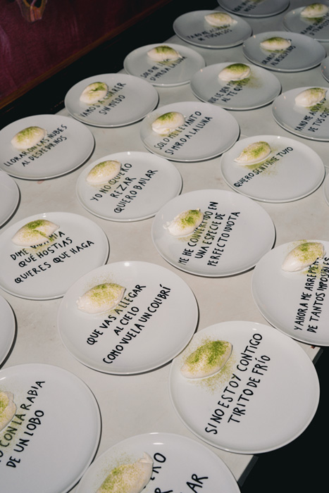 El grand finale fue que en los platos del postre cada uno de los comensales tenía inscrita una frase del disco, y Selma de Hook se apresuró a decirnos que podíamos llevarnos el suvenir a casa.