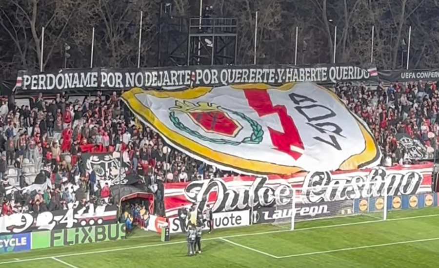 “Perdóname por no dejarte; por quererte y haberte querido”, se puede leer en letras enormes en el fondo del estadio mientras aparecen los jugadores sobre el césped y el “Highway to Hell” de AC/DC da paso a la música de la competición en la que el Rayo Vallecano está presentando sus credenciales por todo el viejo continente. Bajo el escudo del equipo encontramos el título de la canción, “Dulce castigo”, que hace suyo la afición como representación de ese sentimiento que pueden compartir la mayoría de los equipos más modestos... y algún sufridor de los grandes.