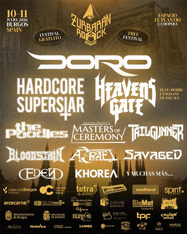 A la espera de que lleguen más nombres con los que se complete el cartel, la propuesta de Zurbarán Rock para 2026 queda por el momento con este impresionante aspecto en el camino hasta completar los 18 nombres en total: Doro, Hardcore Superstar, Heaven’s Gate, Sascha Paeth’s Master of Ceremony, The Poodles, Tailgunner, Azrael, Bloodstain, Savaged, Eden y Khorea.