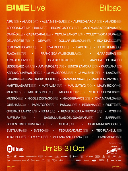 Al igual que otros años, BIME Live, el festival showcases y conciertos de BIME, volverá a transformar la ciudad en un gran circuito de música en directo. Del 28 al 30 de octubre, las salas Kafe Antzokia, Crystal, Stage Live, Back Room, Dock, Bilborock, La Ribera, Sala BBK, y Cotton Club serán las encargadas de acoger más de setenta showcases, conciertos de duración reducida pensados para que artistas expongan lo mejor de su repertorio.