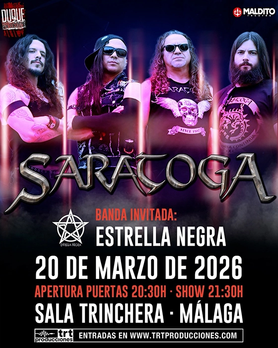 La cita doble será en la clásica sala Trinchera, y promete ser una noche muy heavy. Entradas a la venta en este enlace. De hecho, el concierto, que abrirán los locales Estrella Negra, supondrá el debut oficial en directo en España de Charlie Parra como nuevo guitarrista de Saratoga, tras la salida de Jero, que debajo ampliamos.