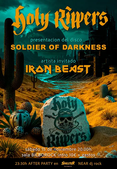 Los vizcaínos Holy Rippers están de estreno. Su primer larga duración, titulado ‘Soldier of Darkness’, verá la luz este viernes 14 de noviembre, y la banda lo presentará en directo al día siguiente, sábado 15 de noviembre, en la sala BilboRock (Bilbao). La apertura de puertas será a las 20:00 horas, con entradas ya disponibles en este enlace. Como invitados especiales estarán Iron Beast, potente tributo a Iron Maiden, y tras el concierto tendrá lugar una afterparty en el pub Shelter (calle Iturribide), con la pinchada de Near DJRock.