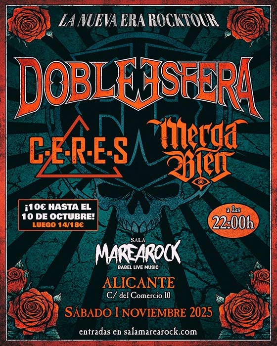 El próximo 1 de noviembre, Doble Esfera desplegará toda su potencia en la sala Marearock de Alicante para presentar su nuevo trabajo, ‘La nueva era del rock’. La cita promete ser una noche de alto voltaje en la que el grupo compartirá escenario con dos formaciones emergentes de la escena alicantina que están dando mucho que hablar: Ceres y Merga Bien.