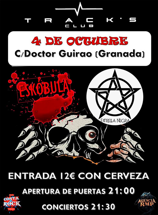 Los veteranos malagueños Estrella Negra estarán tocando el 4 de octubre en el Track’s Club (antigua sala Who) de Granada desde las 21:00 junto a los locales Eskóbula. Los granadinos presentan su reciente nuevo disco, ‘Pies de plomo’, mientras que sus vecinos malagueños siguen presentando el fantástico ‘La profecía’. Heavy metal andaluz de primera que no te puedes perder, y todo ello de la mano de la Asociación Costa del Rock.