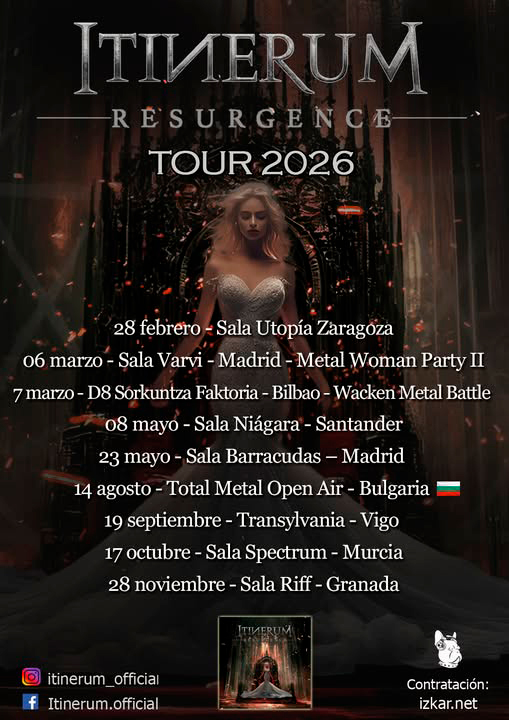 Además, también han tocado en el Wacken Metal Battle, concurso de bandas auspiciado por uno de los festivales de metal más importantes del mundo, el Wacken Open Air. Durante sus próximos espectáculos llegarán con su segundo disco ‘Resurgence’ (2025), que también presentarán en la sala Barracudas de Madrid el 23 de mayo. Con este trabajo evolucionaron hacia sonidos más envolventes y personales, reflejando su madurez y consolidación como banda. Este nuevo catálogo de canciones se une a ‘Dream and Fly’, su disco debut. Por ahora, estas son todas las fechas de conciertos que Itinerum tiene entre manos: