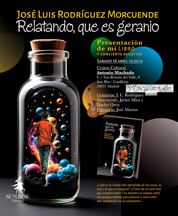 José Luis Rodríguez Morcuende, otrora miembro de Ñu, líder de Isthar y del proyecto que lleva su nombre, Morcuende, presentará su nuevo libro en Madrid. La obra ha sido publicada bajo el título “Relatando, que es geranio”, de la mano de Sunrise Editorial.
