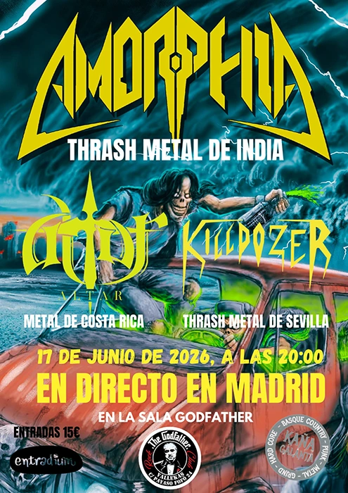 Curiosa e interesante noche de thrash/death metal underground la que se avecina en junio en Madrid. Los sevillanos Killdozer informan que estará teloneando a un grupo particular como son los indios (sí, de la India) Amorphia, en la parada en la capital de España para su gira europea. Abriendo la velada estarán los costarricenses Altar, además de los citados Killdozer.