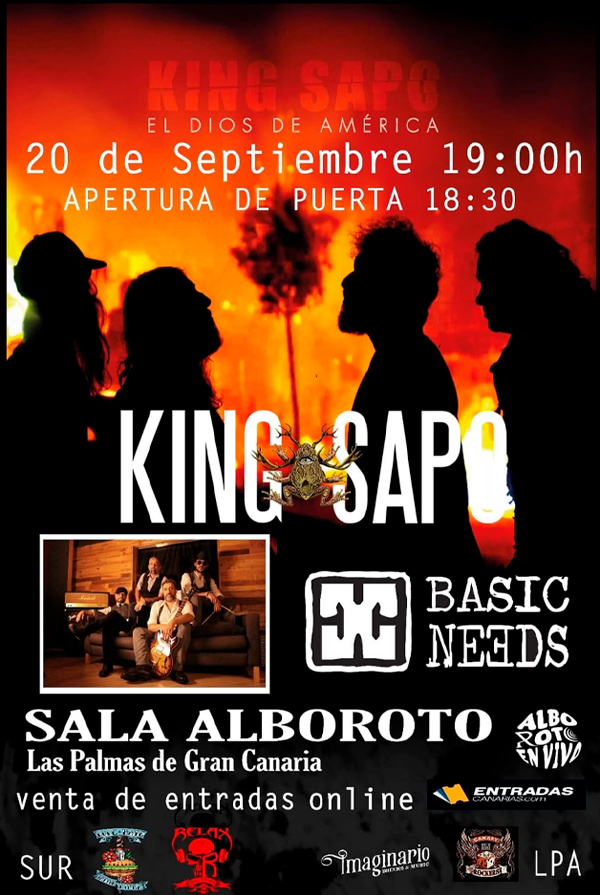 Los rockeros King Sapo tocarán en Gran Canaria el 20 de septiembre en la sala Alboroto de Las Palmas, en un concierto “que promete dejar al público con la boca abierta”. La noche la abrirán Basic Needs a las 19:00 y nuestros protagonistas saltarán al escenario a las 20:00. Entradas a la venta en entradascanarias.com.
