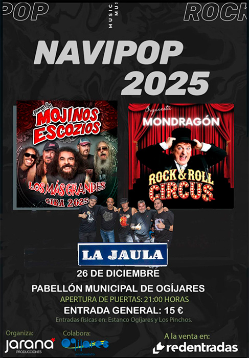 La Jaula será uno de los atractivos del cartel de la edición de 2025 de Navipop, evento que se llevará a cabo el 26 de diciembre en el Pabellón Municipal de la localidad granadina de Ogíjares. Este cartel tendrá como aliciente a los Mojinos Escozíos, una de las bandas de mayor abolengo en la escena rockera española con su toque cómico inconfundible, amén de la Orquesta Mondragón, cuyos festivos temas tiñeron el paisaje sonoro de los años ochenta. Las entradas están a la venta en este enlace.
